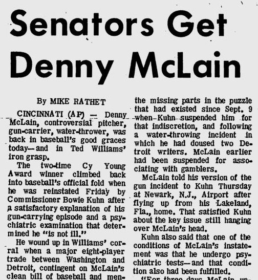 1970: The Washington Senators traded Ed Brinkman, Joe Coleman, Jim Hannan and Aurelio Rodriguez to the Detroit Tigers for Elliott Maddox, Denny McLain, Norm McRae and Don Wert.